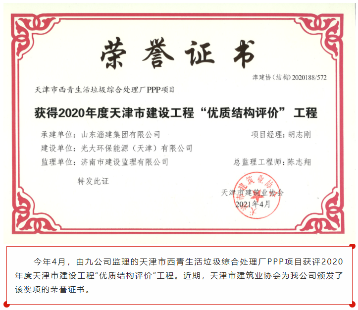 濟(jì)南監(jiān)理天津市西青生活垃圾綜合處理廠PPP項(xiàng)目獲評(píng)2020年度天津市建設(shè)工程“優(yōu)質(zhì)結(jié)構(gòu)評(píng)價(jià)”工程