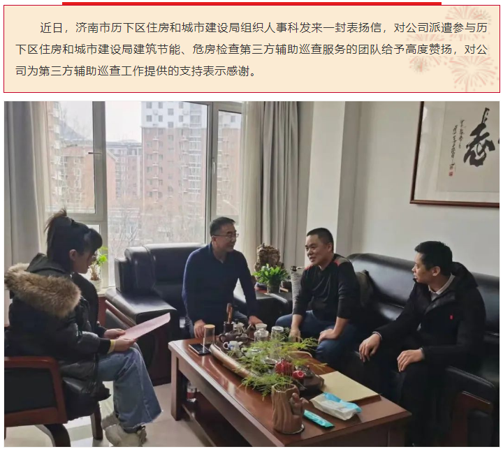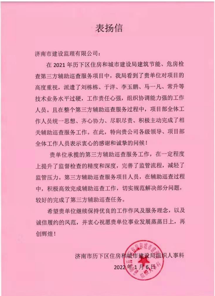 點(diǎn)贊!公司第三方輔助巡查服務(wù)團(tuán)隊(duì)獲歷下區(qū)住房和城市建設(shè)局組織人事科來信表?yè)P(yáng)